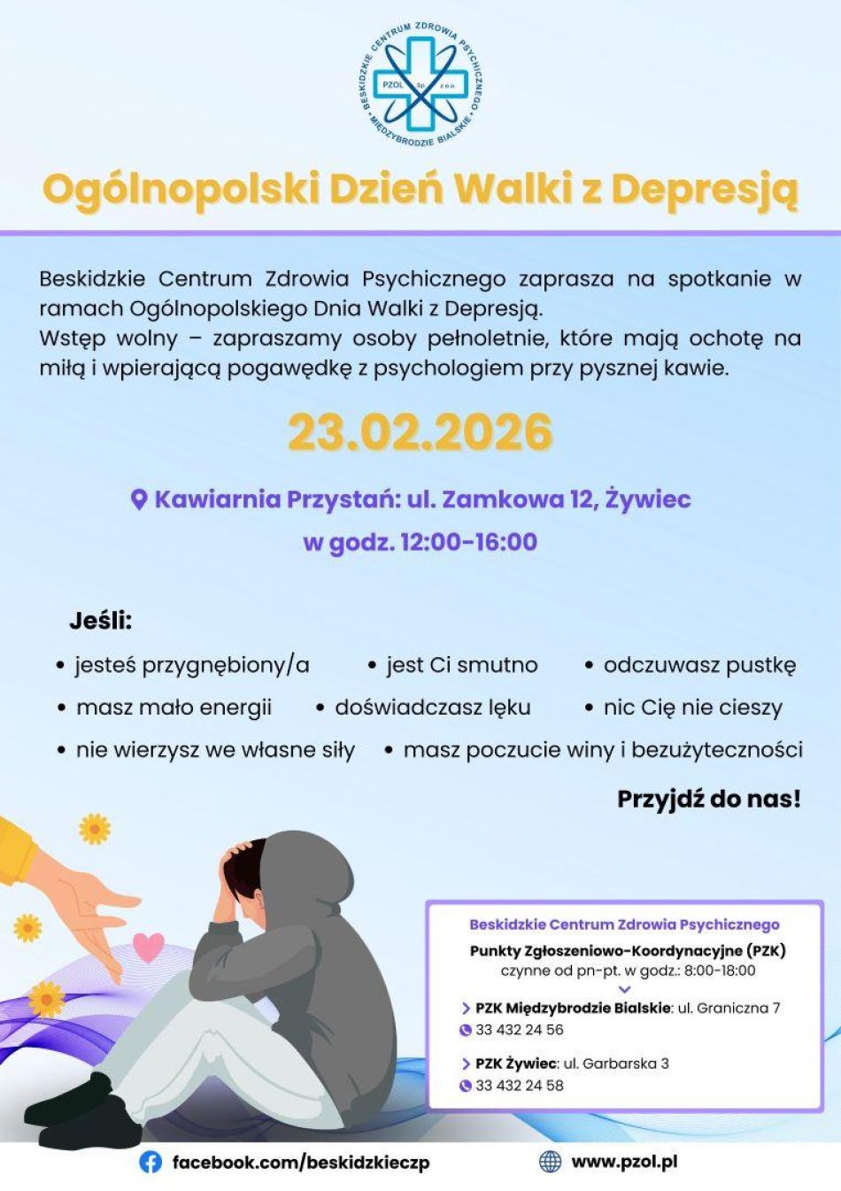 W ramach obchodów Ogólnopolskiego Dnia Walki z Depresją mieszkańcy regionu będą mogli wziąć udział w wyjątkowym spotkaniu organizowanym przez Beskidzkie Centrum Zdrowia Psychicznego. Wydarzenie odbędzie się 23 lutego 2026 r. w godzinach 12:00–16:00 w Kawiarnia Przystań przy ul. Zamkowej 12 w Żywiec.